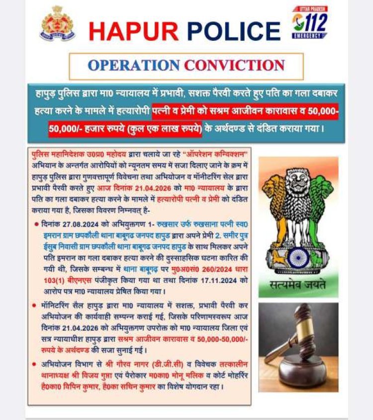 ब्यूरो रिपोर्ट : News Flash INDIA: जनपद हापुड़ के न्यायालय ने एक ऐतिहासिक फैसला सुनाते हुए अपने ही पति की हत्या करने वाली पत्नी और उसके प्रेमी को आजीवन कारावास की सजा सुनाई है। इस रोंगटे खड़े कर देने वाले मामले में सबसे बड़ा आधार मृतक के 5 वर्षीय मासूम बेटे की वह चश्मदीद गवाही बनी, जिसने अदालत में अपनी माँ के 'खौफनाक सच' को उजागर कर दिया।