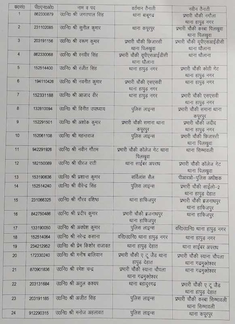 हापुड़ में SP की तबादला एक्सप्रेस, 7 इंस्पेक्टर सहित 44 उप निरीक्षको के तबादले।